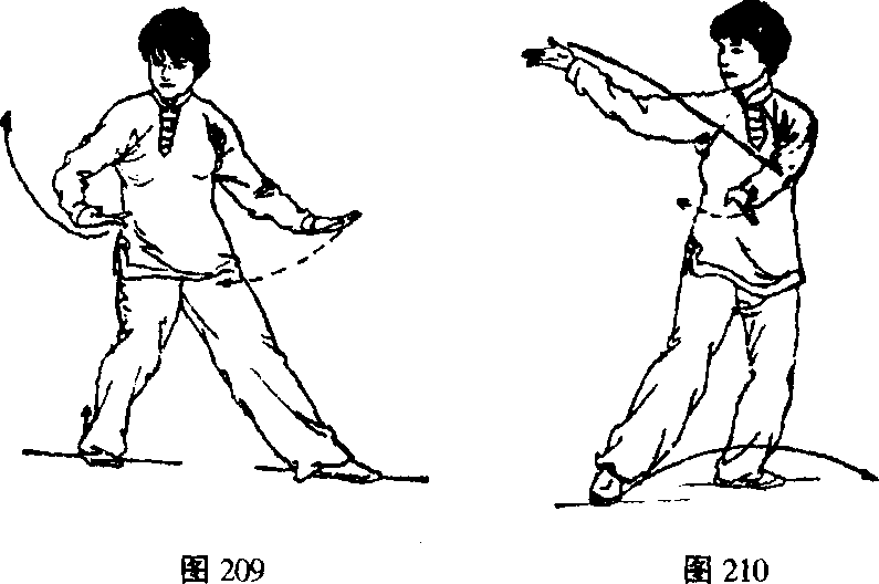 ① 身体右转;重心移向右腿;随之左手向下、向右划弧 于胯左前方,指尖朝左,掌心向下。右手收于腰间,指尖朝 左,掌心向上;眼看右手(图209)。