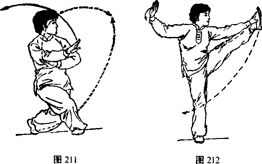 擦脚中主要包含三种技法:技法①转体右捋(图209); 技法②上步叠臂(图210、图211);技法③分掌拍脚(图 212)O