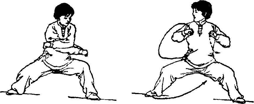 ② 两腿屈蹲沉胯,重心向右腿移动,两臂均屈肘叠臂合 住劲交叉于体前;两手变拳,拳心向下;接着,上体迅速微 右转(胸向南);两臂尽量屈肘,以肘尖为力点向两侧后下 方发劲顶击,这时沉胯成马步;眼平视右方(图238~图