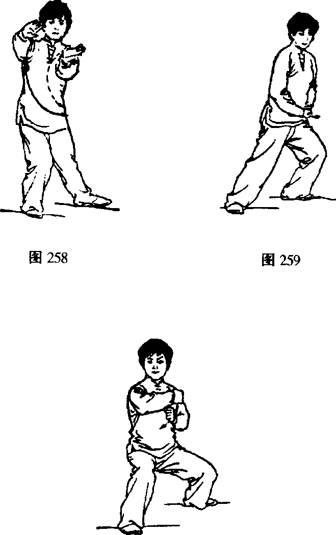 ③ 重心移向右腿,并两腿屈蹲,上体微右转(胸向东 南);右臂屈肘横于胸前并与左拳一起向右前糊击,右拳与 左胸同高,拳心向里。左拳在右前臂内下方,臂微屈,拳眼 向上;眼看右前方(图260)。