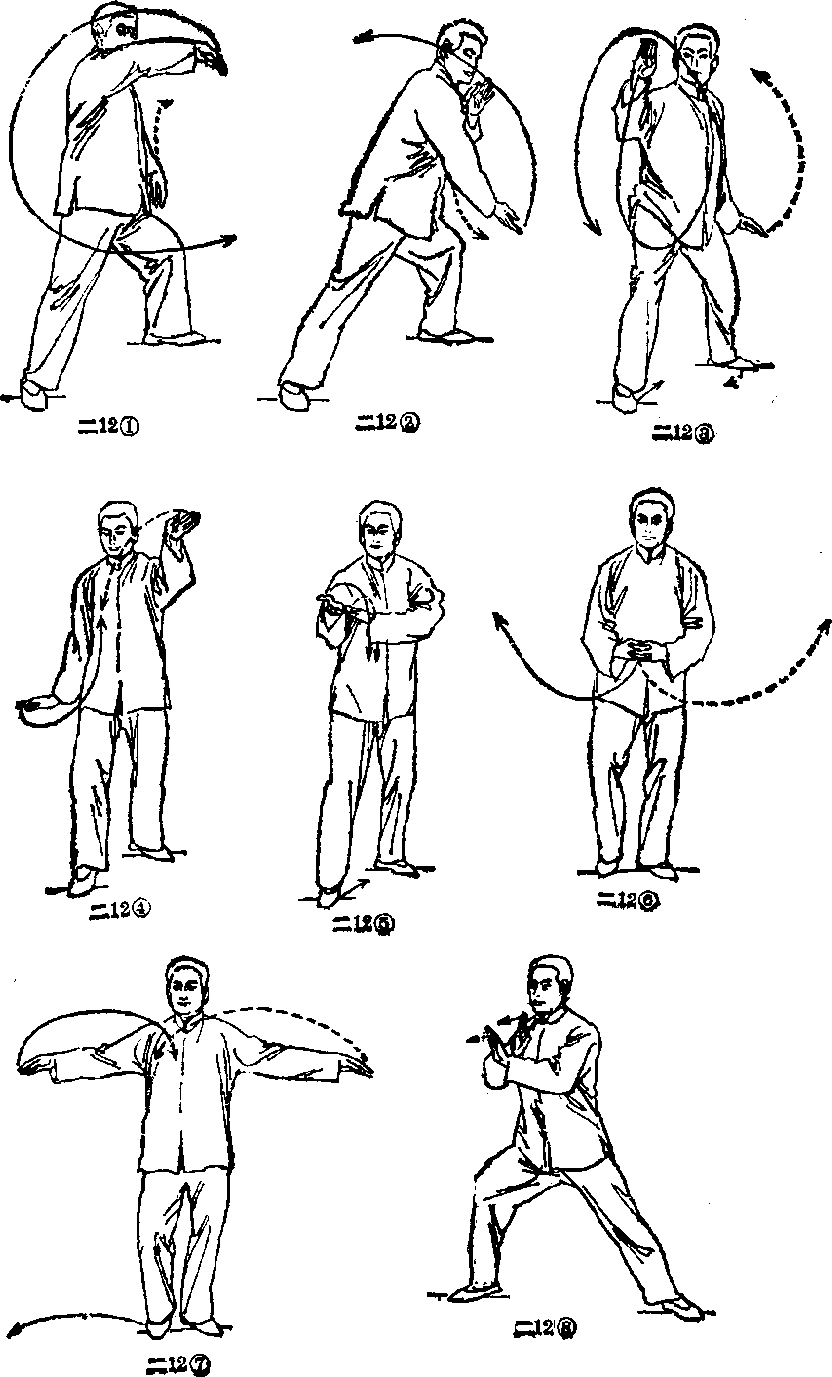 ② 图二12④为大转身法,右手先松落为承接来势弓L进落 空,右转旋绕一大圈时,应圆活无凹凸,并有肩靠、肘靠、 臂靠之意,暗藏探手和切掌,辅以右脚里合腿法,腿手并用 而令对方仆跌。此手法之巧全仗身法的上下配合,转关在 腰。图二12⑦中两手沿下弧双分时,劲点在腕背,向下为按 劲,以引化对方施于我身的挤劲而使对方失重落空,即以下 一着的上合下开势的双顺双合手法,切对方的颈项动脉,或 双峰贯耳。所以,开合转换应迅即、圆顺,而又全凭胸腹开 合折饕运化。