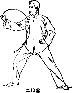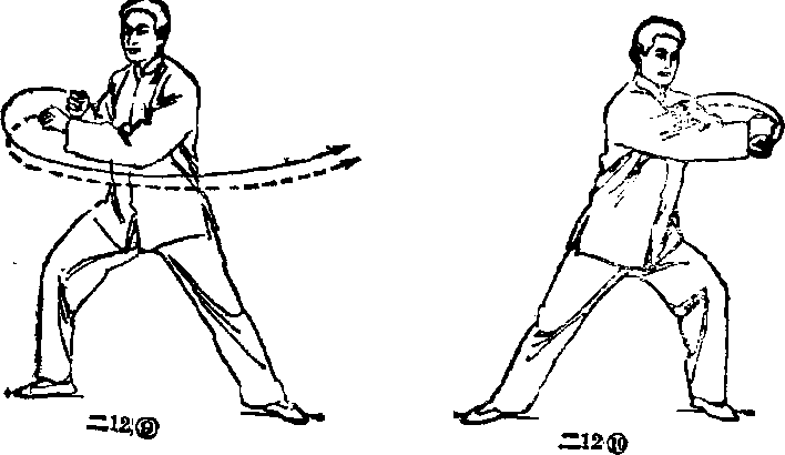 在眼神心意的引领下,两拳沿平圆轨迹的前弧线自右向 左盘旋至左胸前,同时领腰向左转,重心随之左移,左腿外 旋弓屈,右腿内旋伸展;头随身转,目视左前下方(图二12 ⑩)。