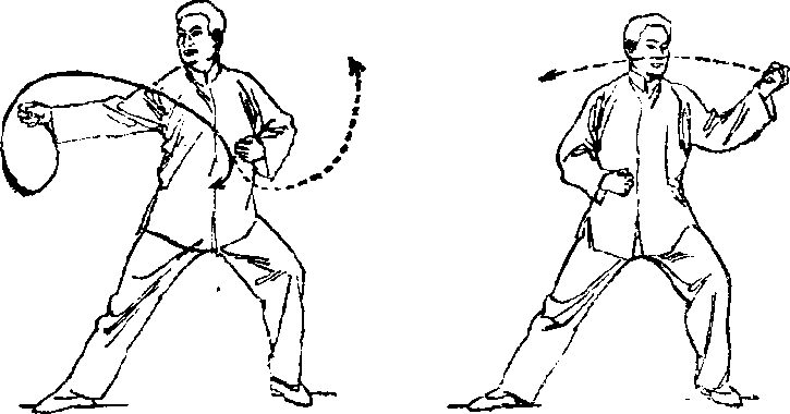 动作四:心气一松,右拳随腰右转,先向右下方缓缓松 落,重心右换,右脚实,左脚虚。再随心意左顾引领,腰向 左旋,重心左移,右腿内旋蹬展,左腿外旋前弓,以身领右 拳自右下方向上再经体前向左顺缠旋绕一大弧至左前方,拳 心朝左后上方,拳眼斜朝右前上方。