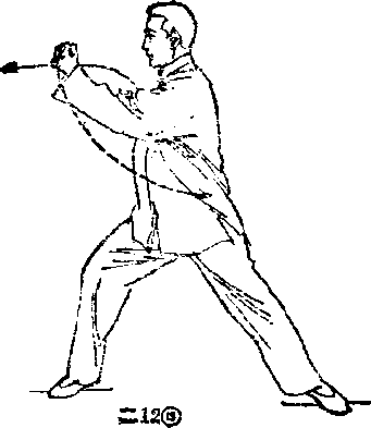 腰右转,重心右移,右腿前弓踏实,左腿伸展虚蹬,同 时以身领左拳向右前上方徐徐运行至右前方(西南角),拳心 朝后上方,拳眼朝左上方,右拳仍微贴右腹腰侧;头随身 转,目视左拳方向(图二12?);