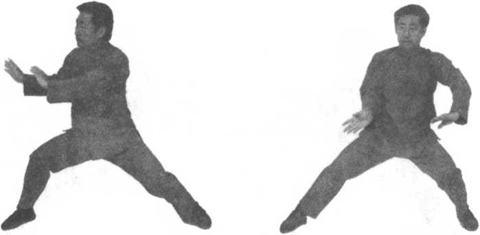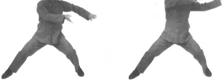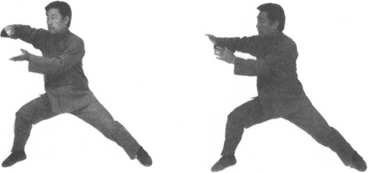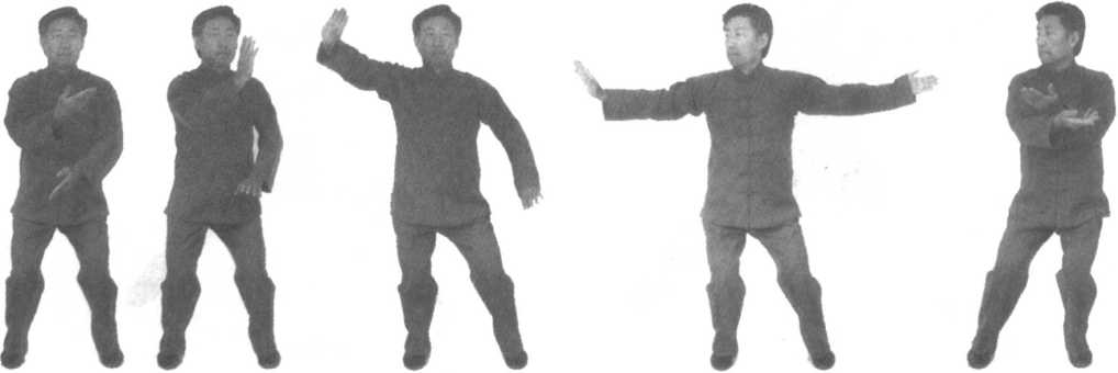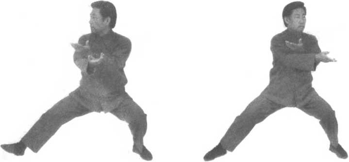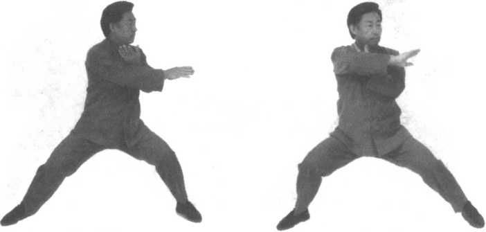 口令1(图4-23、24、25) 重心右移,双手分开,左手向下划弧于左侧外,右手向上划弧至 右侧。