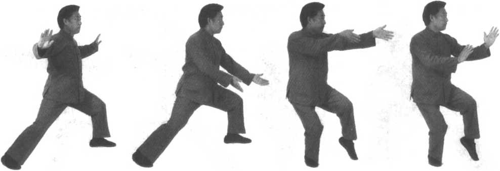口令3(图4-94) 重心移至左腿,同时身体左转,左手向下划于左雕外侧,右手向前推