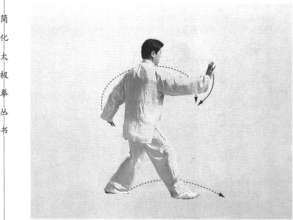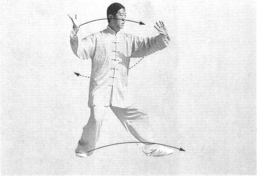 图42动作四:身体微左转。左腿向左上一步,脚跟着地, 脚尖上翘。同时,两手左逆右顺缠丝向上、向前 棚出。目视左侧(图42)。图43