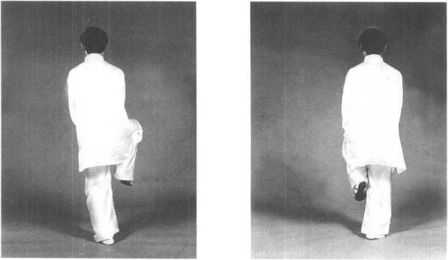 动作二:重心移至左脚,右足提起,身体向右转180。,再连发3 次(图3—77?图3—84)。