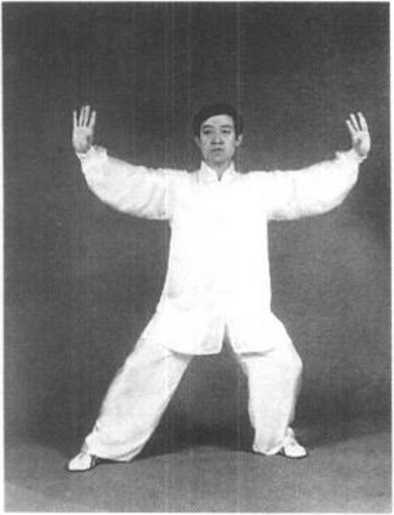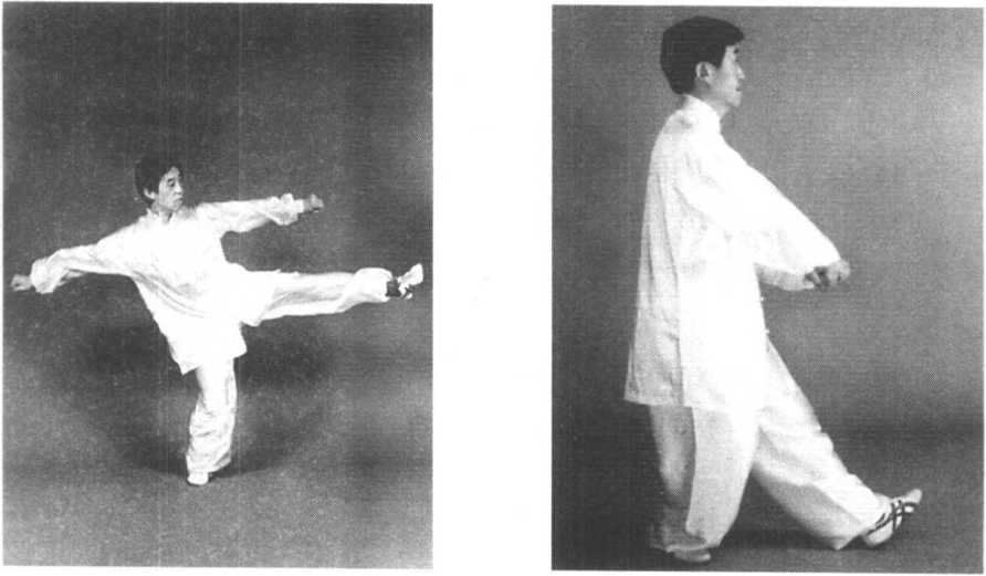 动作四:接上势,身体略下沉,右足向右侧迅速蹬出;同时 两拳向左右发出,其高度与肩平。目视右侧(图3—121)。