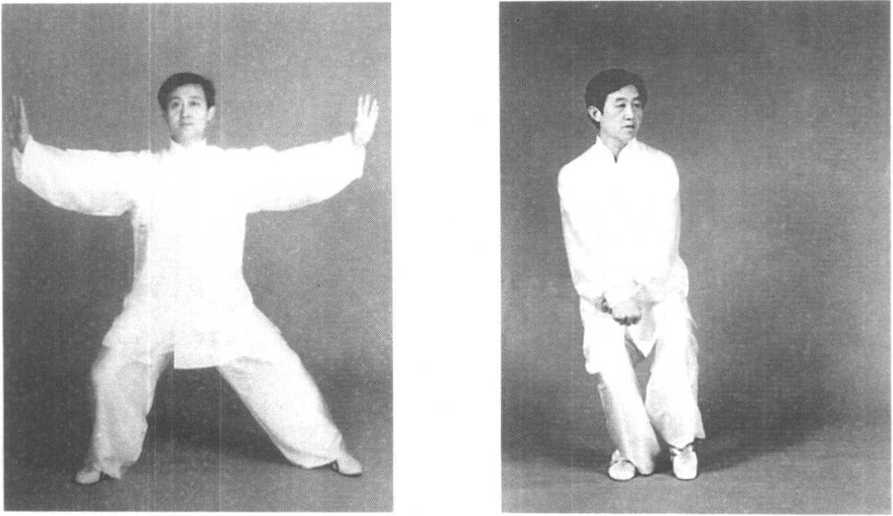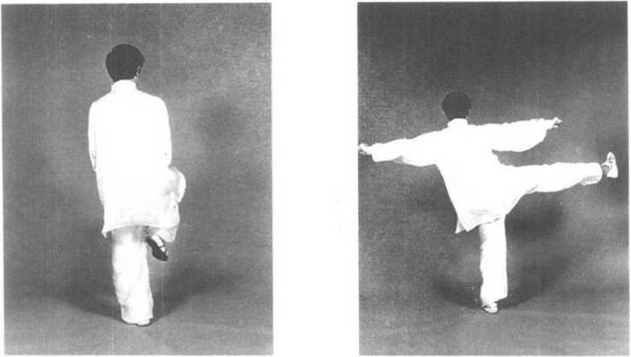 动作三:接上势,身体略下蹲左转,左足跟落地,足尖向外 摆;同时两拳向下沉交叉于腹前(图3—119)。紧接身体向左转 90°,重心移向左足,随转体右足提起悬于裆内。目视身右侧 (图 3—120)。