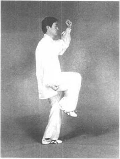 要求:单腿支地,重心稳 固Q两拳发力与扣足转身要完整 一气。