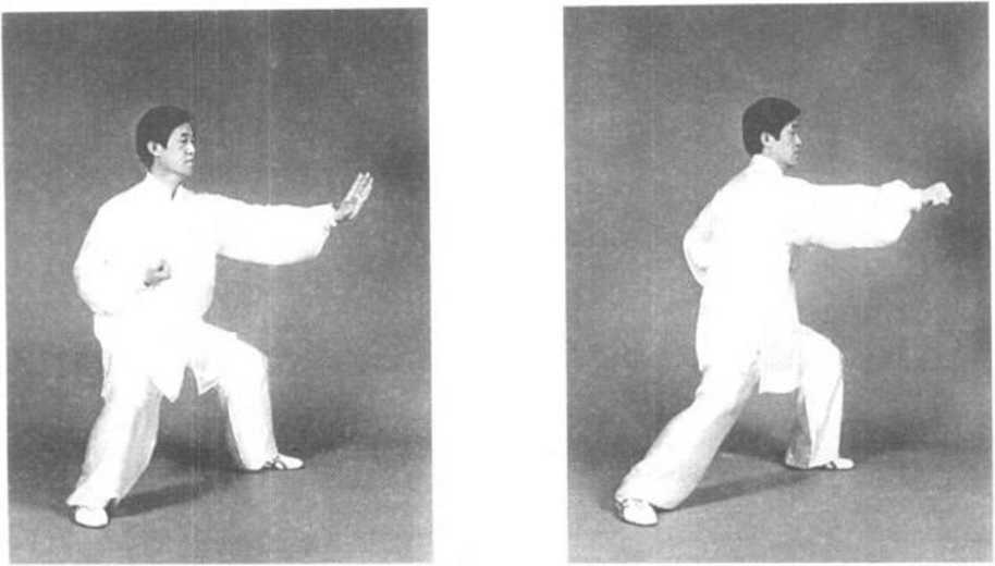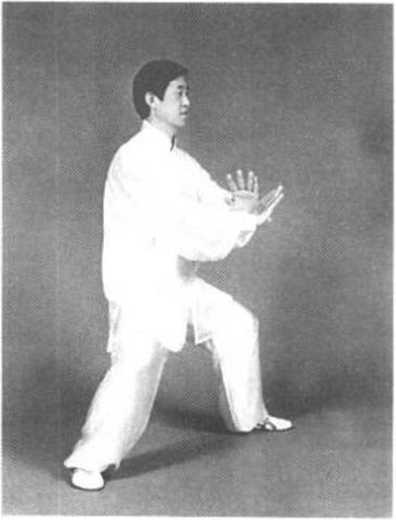 前方上一大步;同时双手合住劲下沉至腹前。其他动作与第十三 式掩手肱拳的蓄发动作相同(图3—124?图3—126)。