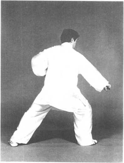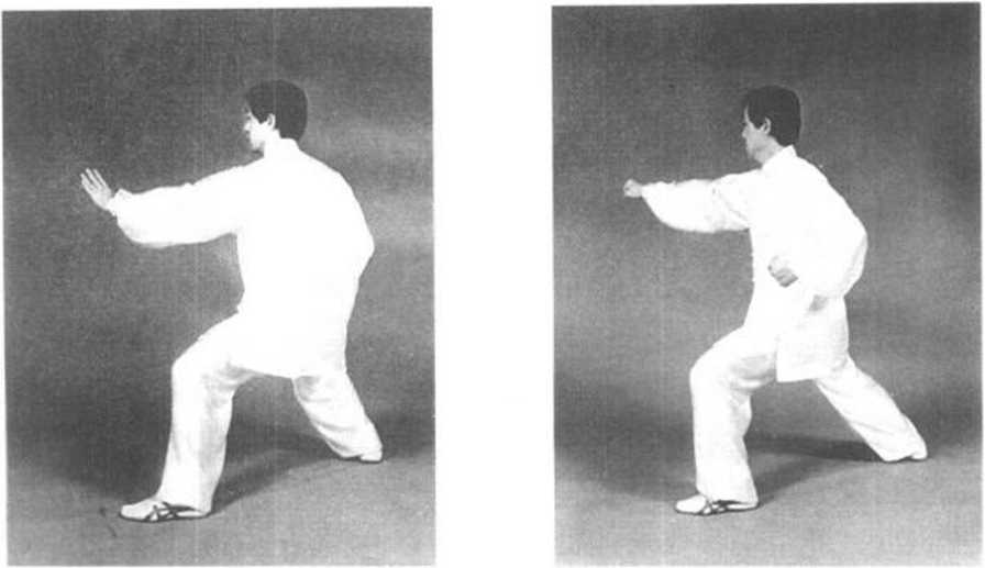 要求:转身、收腿、合力、开步、发拳向下横击要协调一 致,步法与右拳发力时配合紧密,要形到、意到、劲到。