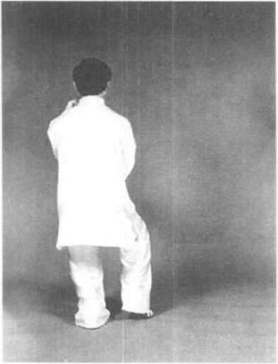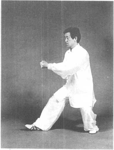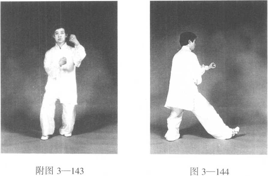 动作一:接上势,身体向右转, 重心移至左足;同时右足提起收 回,虚足以足尖点地。右拳顺缠向 后向里收至腹前,拳心斜向上;左 手握拳,由上向下与右拳环抱,拳 心斜向里,目视右前方(图3— 143、附图3—143)。紧接着右足横 开一步,重心随即右移,右拳向右