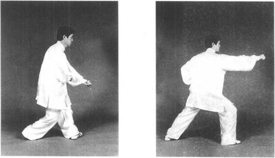 动作一:接上势,左足向前上步,身体向右转约180°,重心控制 在右足,同时左拳逆缠向左前发出,拳心向下,其高度与肩平;右拳 顺缠以肘向后击出,拳收于右肋侧,拳心向里。随着发左拳,重心 由右足同时移至左足。目视前方(图3—148)。