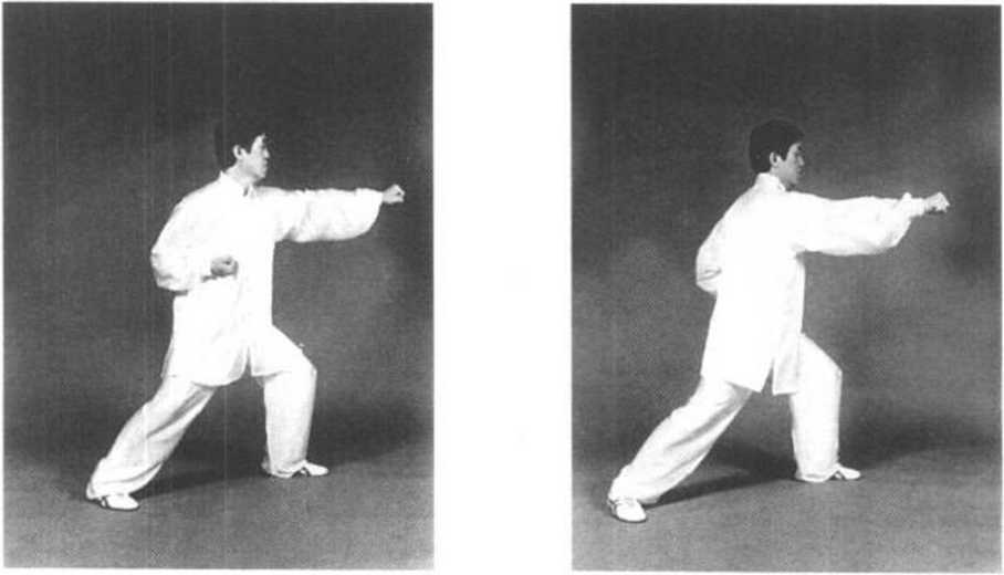 要求:上左步后,左右拳连击,两拳要在重心不变的情况下,结 合腰裆劲要快、猛,力达拳顶。