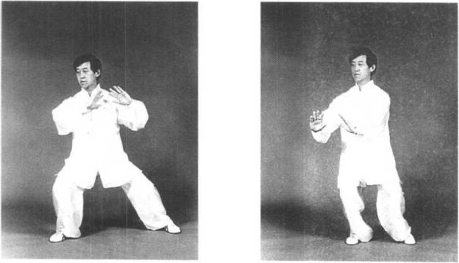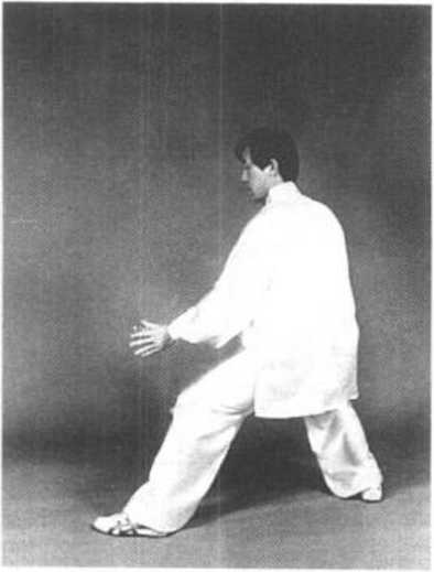 动作口:接上势,重心移 至左腿,身体随之左转150 度;提右腿向右侧上步;同时 两手随转体下撮;目视右前方 (图 2—218)。