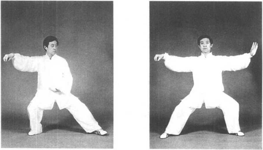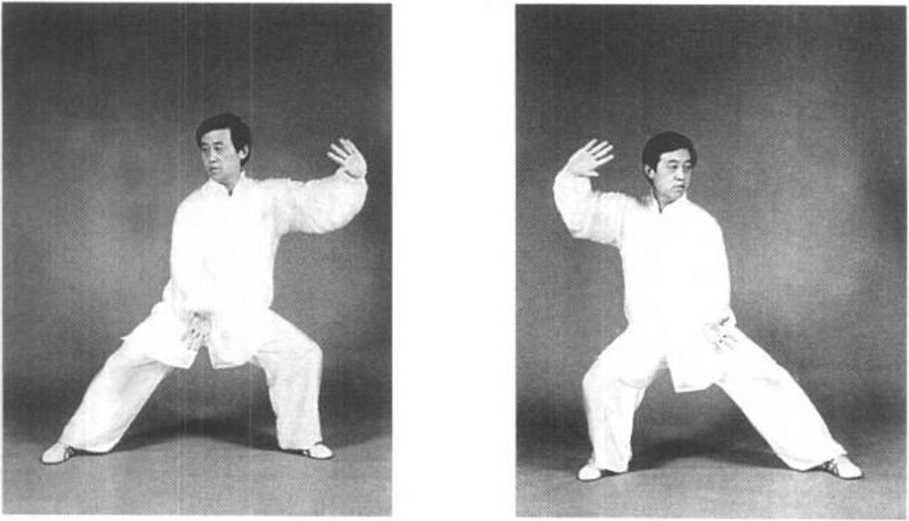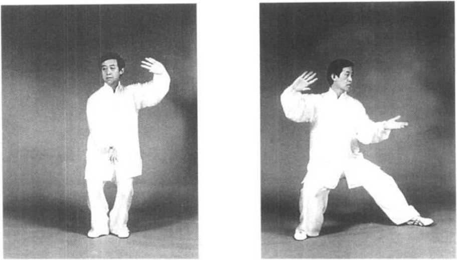 动作一:接上势,身体微左转,重心略向左移;右手变掌顺 缠划弧下沉至腹前,掌心朝左,指尖朝前;左手领劲,脚步不 动;目视身体右侧前方(图2—249)。