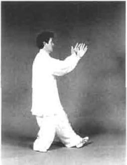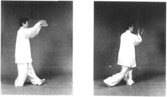 动作二双腕向上使劲,身体松跨下沉(图4-59)。接着左脚尖外摆踏实,身体随之左转重心左移右脚由实变虚同时随着身体左转两臂松肩沉肘坐腕左逆右顺缠丝向前加掘劲(图4-60)然后提右腿向前方上步脚跟着地,脚尖微上翘同时双手随转体左逆右顺缠向右下松沉合于胸前(图4—61)。