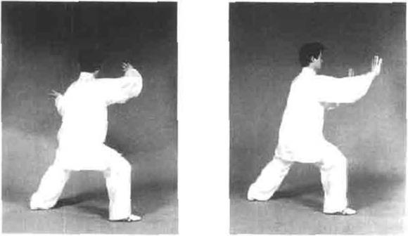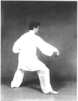 图4—150图4—150右后方弹击左手掌心向下随转身轻贴胸前。目视右后方(图4—151)。