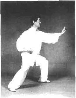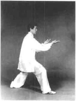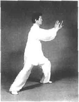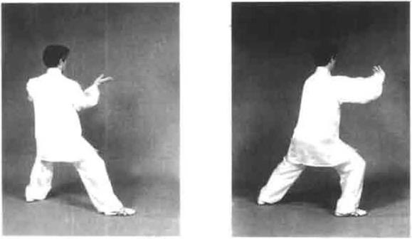 动作四重心向左移身体略右转右脚弧形向左再弧形收回到左脚内恻稍前以脚尖点地同时左手经过腹前横掌向前上伸出右手稍向左合于左肘下方(困4—149)。身体略右转同时重心控制在左脚右脚向右后方以脚前掌着地退步到尽头时脚后跟蹬地有声右手五指微屈内扣轻抚腹部右臂随着转身向右后发肘劲左手微顺缠转成立掌向前推拿发劲。左手心向前指尖向上右手轻贴腹部。顶劲领起目视前方耳听身后(图