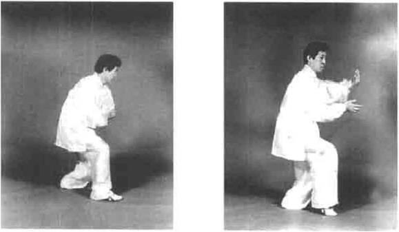 动作三重心再左移双膝外开身体略向左转同时双手折腕逆缠外开左手开至左小腹恻右手向右前展开(图4一147)。接着松右胯身体突然右转左手折腕以手背贴于左小腹处以肘向前下方发劲右手顺缠以掌心相迎拍击左肘双膝突然里合跳步震脚。重心偏右脚目视前下方(图4—148)。