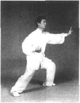 动作六重心左移身体先向左转同时右手利用反弹的回劲屈臂向左,在胸前与左臂合住劲(图4一152)。接着屈膝松胯身体下沉同时左手微顺缠,松肩沉肘展臂向前推出右手屈指抚腹向右下松沉和左手形成开劲。顶劲领起目视左前方(图4-153)。