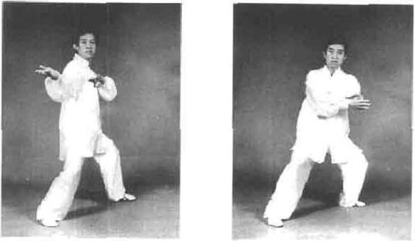 动作一接上势,右手小逆缠左手顺缠上托双手合住劲向左上方搠。然后松左腌重心左移身体微向左转同时双手下沉,左逆右顺缠丝弧形向左振带。目视双手(图4一142-图4—144)。