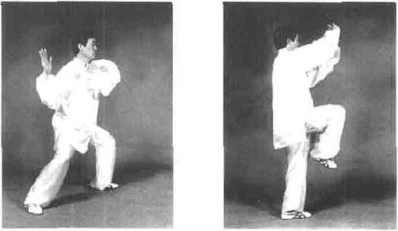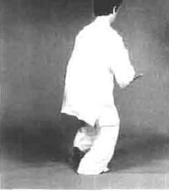 图4一155图4一155图4—156 图4—157图4—156 图4—157动作三右脚落地震脚有声身手随之自然松沉下落重心随即由左脚移至右脚然后松右胯身体略右转下沉,提起左腿以脚跟里侧着地向左方滑出脚尖上翘里合同时左手变掌向右侧微顺缠引劲和右手相抱形成合劲