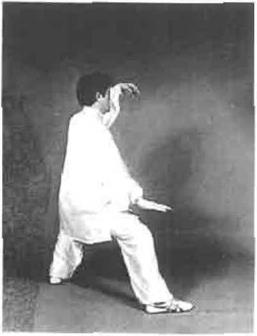 图4—158图4—158动作四松右胯身体向右转重心左移同时左手折腕五指微屈相合以手腕领劲向左侧上方掘出右手微逆缠向右侧下方按出。左手心和指尖向右下方右手心向下指尖向前。顶劲领起,目视前方兼顾左手耳听身后(图4—160)。