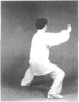 动作一接上势双拳微下沉变掌左顺右逆缠丝向右后上方撮同时右腿屈膝松胯身体向右转重心右移(图4—434)身体放松下沉松左胯左脚尖外摆身体左转重心走下弧向左