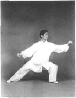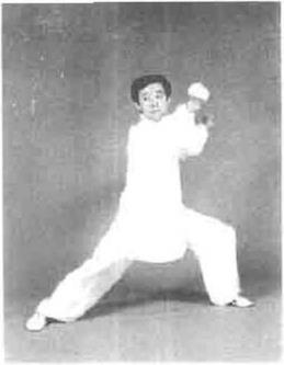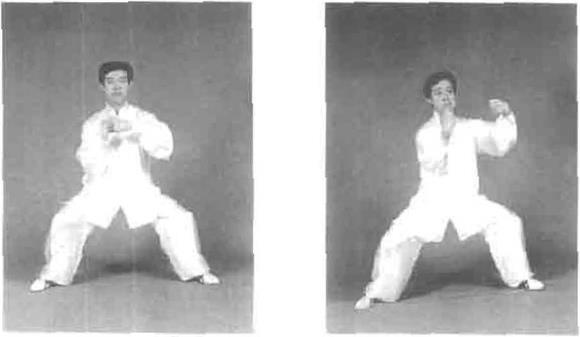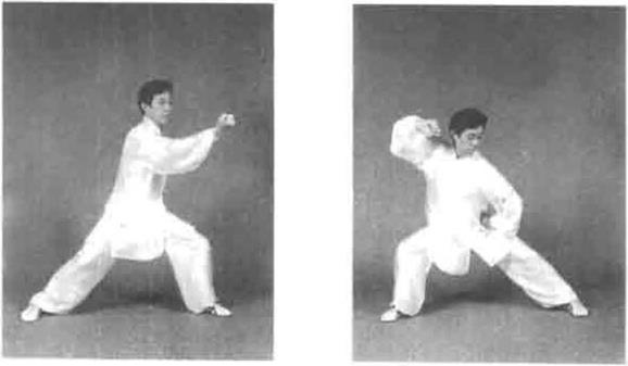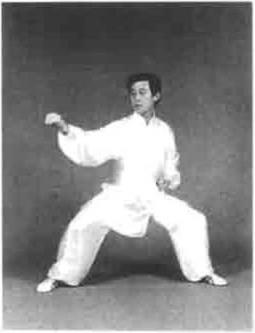 图5—42图5—42重心向右移左脚尖微内扣重心向右移左脚尖微内扣左侧外开发劲目视前方耳听身后(图5—42)。