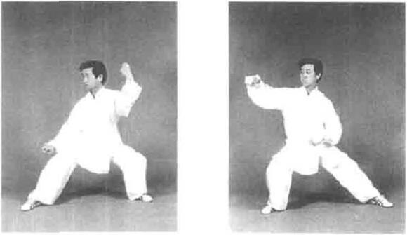 动作六重心左移,身体微左转右拳向左顺缠左拳顺缠沉肘收于左腰际(图5—45)。身体继续左转,右臂向左侧引带然后松右胯身体向右转,同时右拳逆缠向右上方掬出左拳