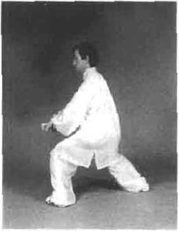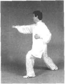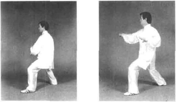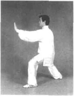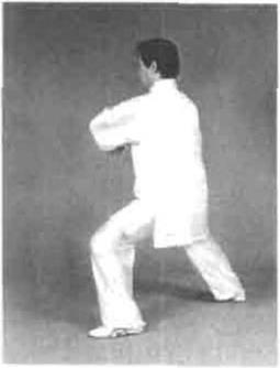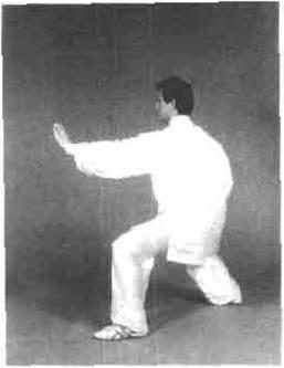 到发劲的过程中,屈膝提起右腿以左脚跟为轴向右后旋转1阶。目视前方(图5—118、图5—119)