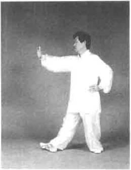 动作六动作六身体右转重心右移左脚向右侧上步,脚尖着地,身体右转重心右移左脚向右侧上步,脚尖着地,动作五右手下沉身体下沉左转左脚向右后倒步重心左移身体左转180°同时右手顺缠向左划弧。然后右脚随转体向左跟进,脚尖点地右手经胸前向左侧顺缠引劲。右脚向右侧开步再松右胯身体右转右脚尖上翘外摆。右手下沉逆缠向右划弧。目视右手(图5—175、图5—176)。