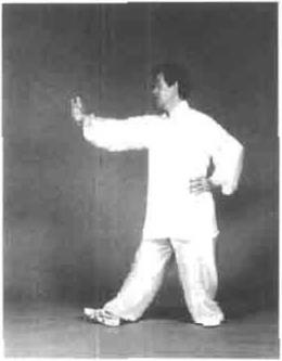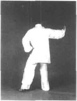 图5—76图5—76动作七左脚向右后倒步,身体左转180。右手随转身顺缠至右侧口重心在左脚。目视右手耳听身后(图5—178)。