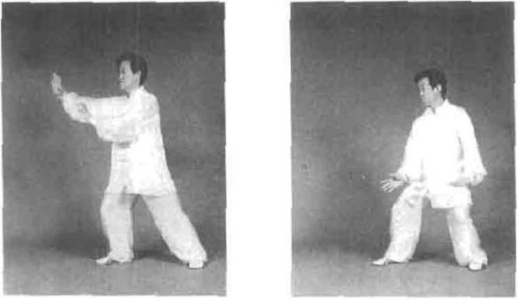 动作三右手又在右腰间左手顺缠向右侧引劲同时重心移
