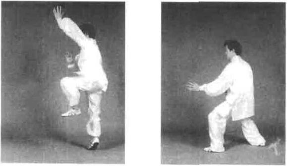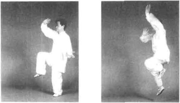 动作二右手向右上方逆缠翻掌左手小顺缠成手心向上同时身微右转右腿屈膝提起(图5—181)。左脚蹬地,双手合住劲左顺右逆缠丝由左侧向上领起身体使身体在空中向右转约135。双脚右先左后震脚落地双手随之略变左逆右顺缠丝以掌缘向下弹击。重心控制在右脚。目视前方耳听身后(图5-182?图5一184)。