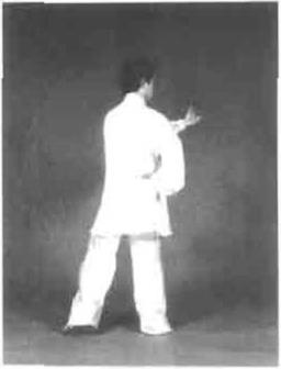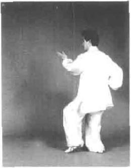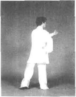 动作七身体右转右脚向左后倒步,重心接着右移左脚尖点地身体右转180。同时左手顺缠向右划弧。目视右侧耳听身后(图5—191)