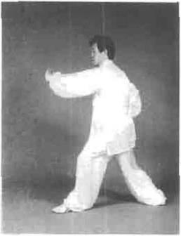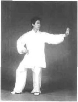 动作六左手略向右侧引劲左脚向左侧稍开步。接着松左胯身体左转左脚尖外摆同时左手逆缠翻掌随转体向左划弧(图5—189)左手划弧不停松左胯重心左移,右脚向左侧上步脚尖着地,身体左转1好左臂伸展于左侧高与肩