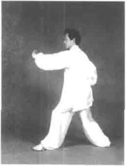 动作四重心左移提右脚向左侧上步身体左转1期同时左手随着转体向左展臂逆缠,高与肩平重心在左脚右脚尖点地。目视左手耳听身后(图5—187)
