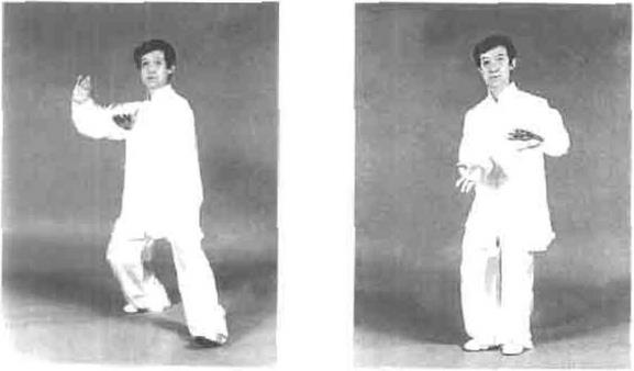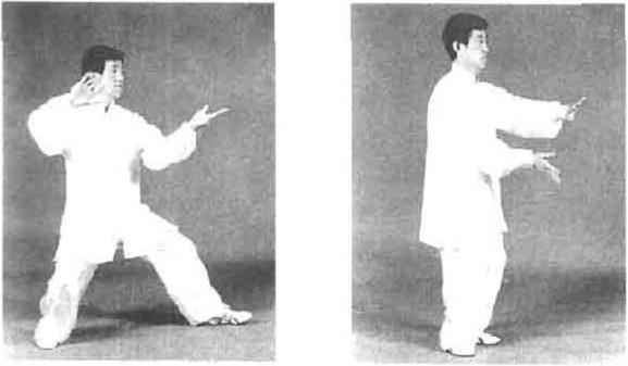 手变左逆右顺缠走下弧向前搠,目视前方(图1—38)。然后再上手变左逆右顺缠走下弧向前搠,目视前方(图1—38)。然后再上图1—37图1—37图1—38图1—38动作三接上势重心移至左腿右脚跟步与左脚并齐同时两