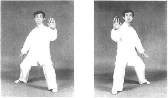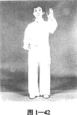 动作一两腿并立目视前方。右手合于右腰间左手心朝前并向前推出沉肘松肩(图1—42)