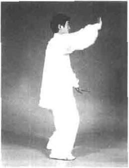 动作二接上势重心移至右腿提左腿向后退一步,左脚尖着地身体随倒步左转两手成开劲目视前方(图2—38)。
