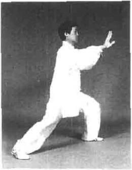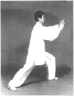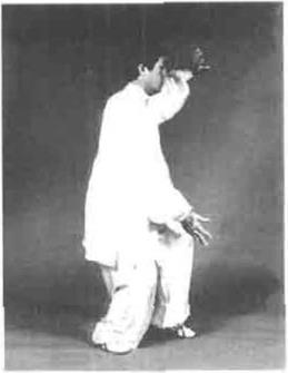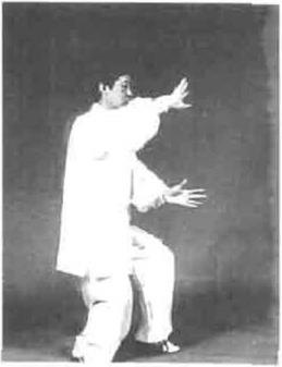 要求塌腰松腑,重心随身体微左转前移切勿弯腰探身。此动两手相合时吸气。