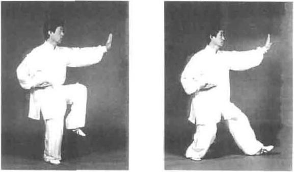 动作三接上势身体左转,重心在右腿左脚尖虚点地左手逆缠划弧上搠右手顺缠划弧向下与左膝相合目视身体右前方(图2—)
