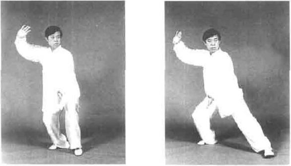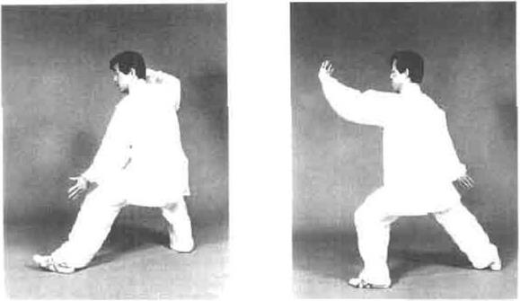 动作一接上势身体向左转下沉重心在左腿提右腿向前上步同时右手顺缠向下合于右膝内侧,左手逆缠上掘目视身右侧(图2—211)。