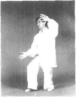 动作四接上势身体微左转重心移至左腿同时左手逆缠外翻上搠至左额前右手顺缠下合于右膝上目视左前方(图2—214)。