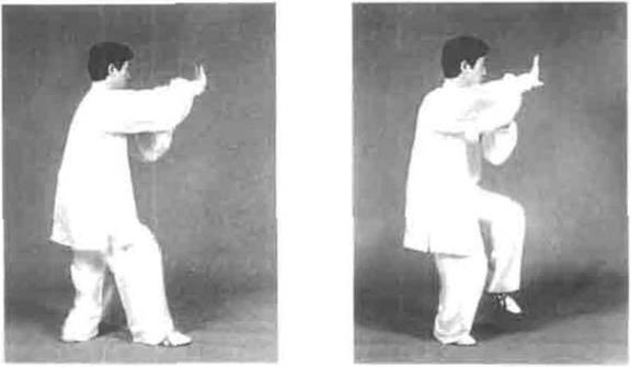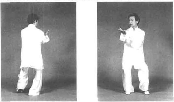要求重心移动裆走后圆,扭腰转胯手足相合。此动吸气。