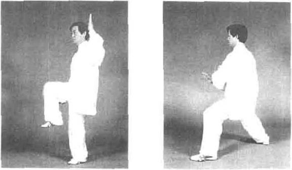 动作二接上势身体向左转左脚尖外摆同时右拳向右前上方冲右腿提起目视右前方(图2—279)。